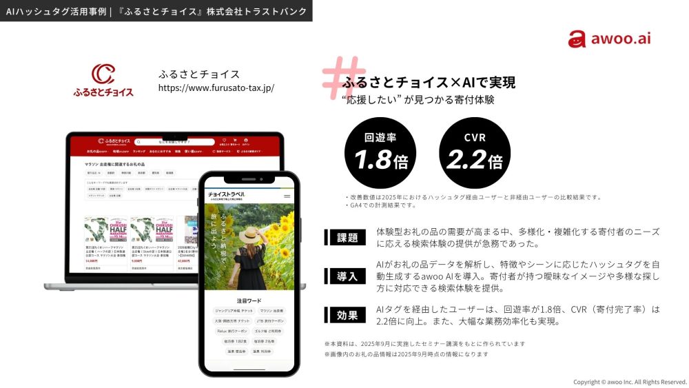 awoo株式会社(本社:東京都渋谷区、Japan Country Manager : 遠藤 光一、以下「awoo」)は、国内最大級のふるさと納税総合サイト「ふるさとチョイス」を企画・運営する株式会社トラストバンク(本社:東京都品川区、代表取締役社長兼CEO:大井 潤、以下「トラストバンク」)が運営するふるさと納税ポータルサイト「ふるさとチョイス」における「awoo AI」導入事例を公開しました。