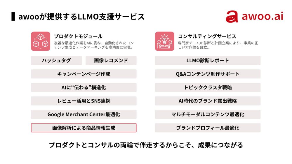 現在ではさらに領域を拡張し、GEO(Generative Engine Optimization)/LLMO(Large Language Model Optimization)など、“AI時代のコンテンツ最適化”を企業と共に推進しており、今回の「awoo Description Writer」もその一環として位置づけられています。