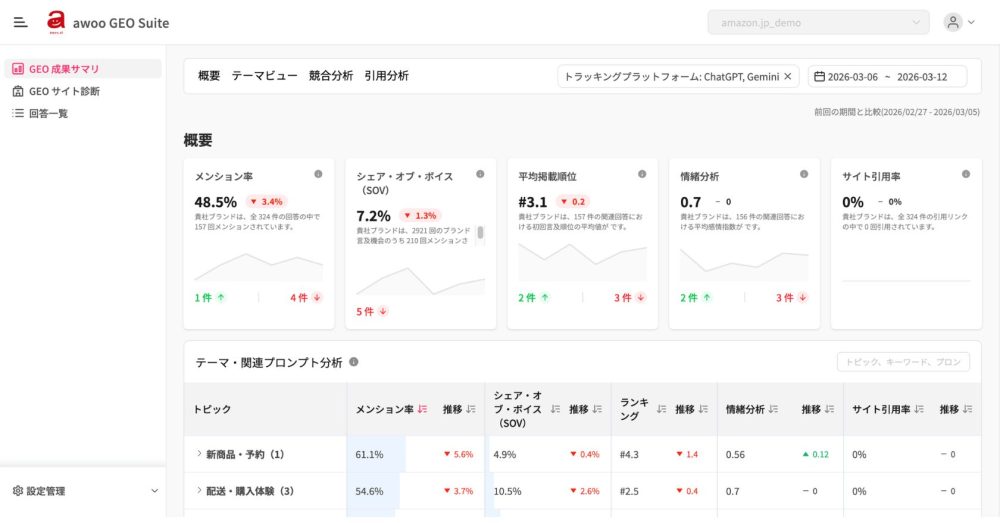 awoo GEO Suiteは、こうした“生成AI上のブランド評価”を見える化し、企業のGEO(Generative Engine Optimization)推進を支援します。