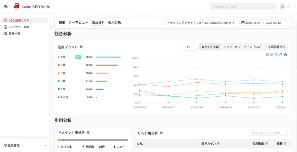 - サイト引用率:生成AIの回答において、自社サイトや関連ドメインが情報参照元としてどの程度取り上げられているかを把握できます。