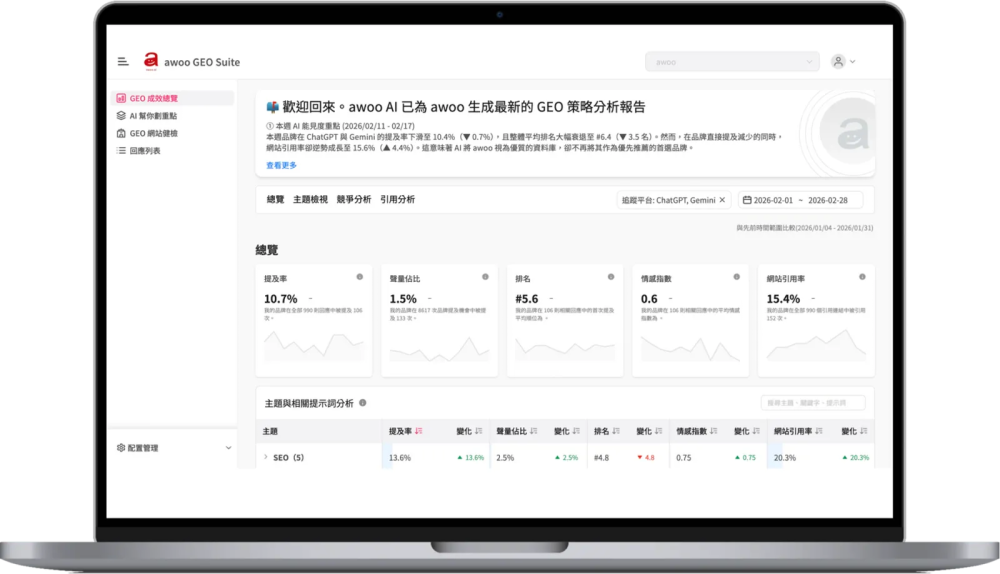 除了數據監測,系統的競爭分析更能提供提及率、聲量佔比與平均排名這三個維度的競品升降比較。然而,龐大的數據若需手動切換報表將失去效率,因此GEO Suite強調自動化分析,能透過AI畫重點並給出具體的「行動建議」。例如,當主題分析顯示品牌在「SEO」領域常被引用,但在「品牌策略」上較弱時,AI便會建議在網站新增相關內容,以回應使用者問題並提升該主題的AI聲量。