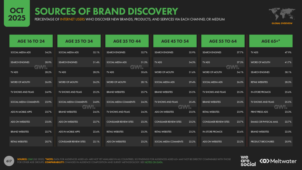 消費者的搜尋習慣正在悄悄改變。數據顯示,過去一個月使用「傳統搜尋引擎(如 Google)」的全球網路成年人比例降至 80.3%,這是近年來數據的新低點。從下圖中可以看出,對於 16 至 34 歲的年輕族群,「社群媒體」也是一種搜尋引擎,甚至他們更習慣在社群平台上尋找資訊、下購物決策