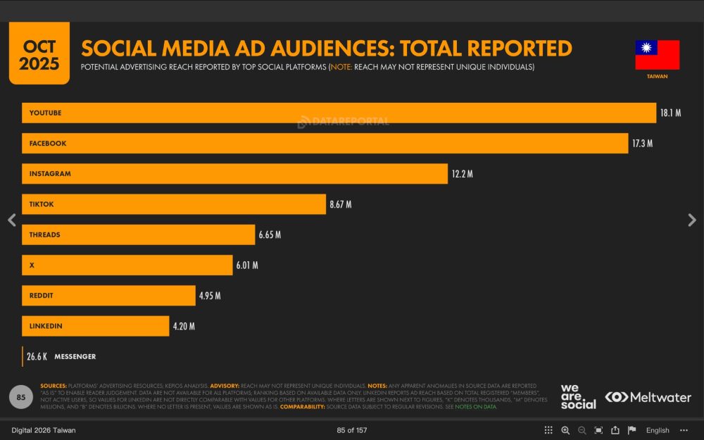 Digital 2026 報告指出,全球社群媒體使用者達 56.6 億,超過地球三分之二人口,其中聚焦台灣市場的社群表現,YouTube 與 Facebook 依然是觸及率最廣的兩大巨頭,廣告受眾分別為 1,810 萬與 1,730 萬,但值得行銷人注意的是「新興文字社群」的驚人爆發力:Threads 在台灣已強勢累積 665 萬的廣告受眾,觸及率直逼台灣總人口的三成,論壇 Reddit 在台灣的潛在廣告觸及人數也突破 495 萬,年增長率更是飆升超過 1000% (+1,029%),成為今年度最受矚目的社群黑馬。