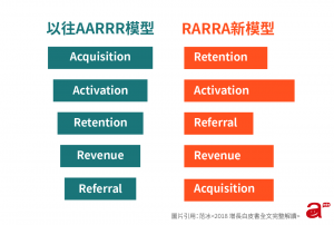 當流量紅利時代已經過去, 廣告與社群流量的費用不如以往便宜,企業要取得一個顧客的成本與日俱增,這時候我們再來看 AARRR 的漏斗模型,可能已經不太能適用在現在的行銷環境,因為 AARRR 主要專注在「獲客到取得營收」的過程,可是現在獲客變得困難,又要如何獲得營收呢?所以 RARRA 的修正模型與之誕生: