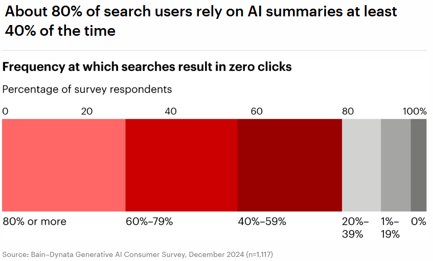 可從 Bain & Company 顧問公司的研究指出,現今八成消費者在搜尋需求時,大約有四成的查詢需求傾向直接依賴 AI 回答,而這一搜尋習慣改變,也使網站自然流量造成了平均下降約 25%,且有超過六成消費者在獲得 AI 回覆後,就停止了更多的搜尋動作。